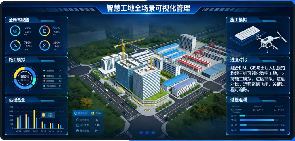 (2)全场景可视化管理:全局驾驶舱一屏看核心数据,融合BIM、GIS与无人机航拍,构建三维可视化数字工地,支持施工模拟、进度对比与远程巡查,关键过程可追溯。